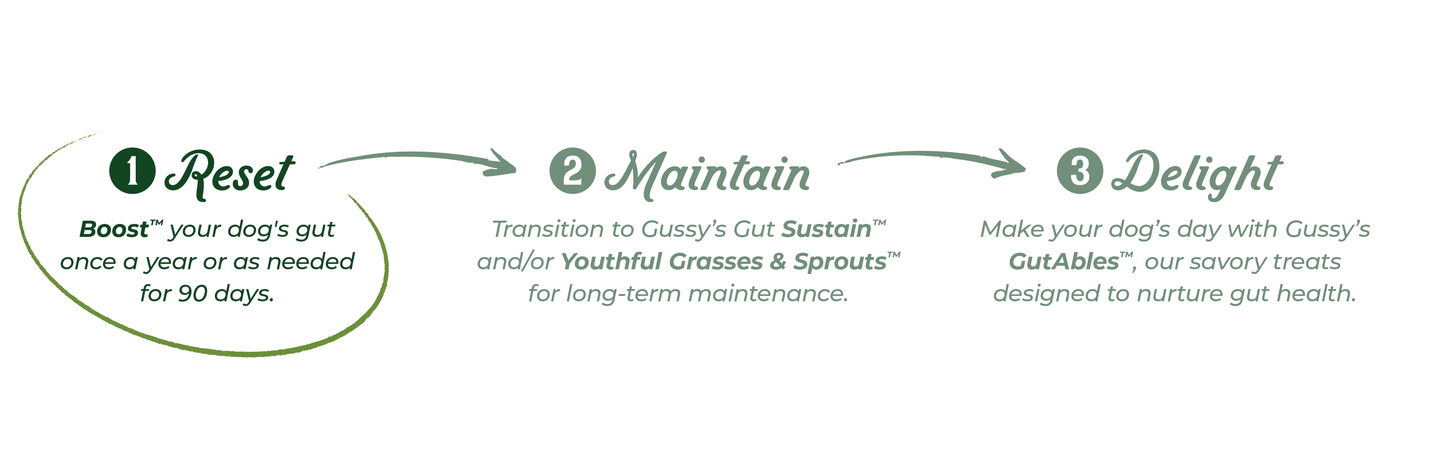 Gussy's Gut Daily Boost supplement package for dogs on a white background